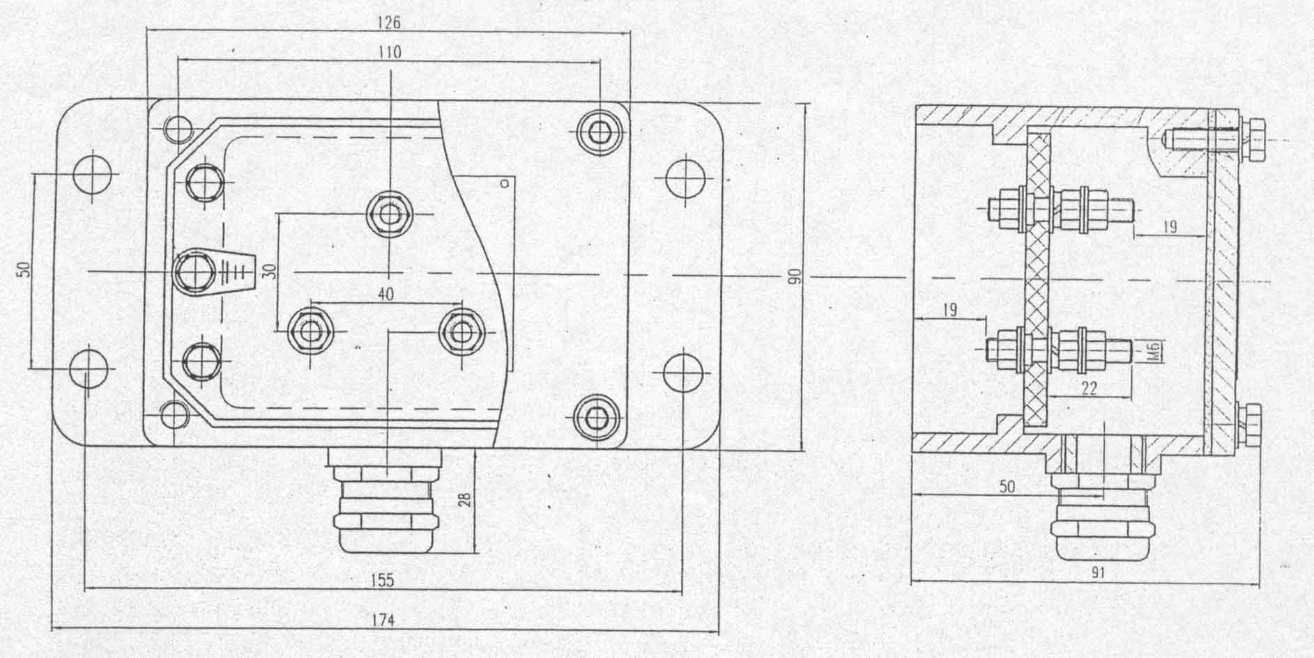 端子箱有箱体与箱盖组成,材质为ZL102铸造铝合金,内接线板上接线螺栓为H62黄铜加工、镀银(见附图),其结构要素均符合GB3836.1和GB3836.3增安型性能要求。